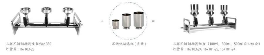 * BioVac 330, 630 多孔不锈钢滤座可以随意搭配 100, 300, 500ml 等三种滤杯,可